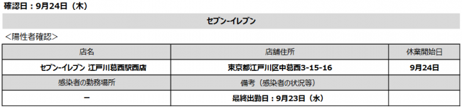 流通スーパーニュース > 新型コロナ > セブン&アイnews|9/25感染者発生、セブン-イレブン江戸川葛西駅西店 セブン&アイnews|9/25感染者発生、セブン-イレブン江戸川葛西駅西店 新型コロナ / 2020年09月25日 ツイート (株)セブン&アイ・ホールディングス(東京都千代田区、井阪隆一社長)が9月25日(金)、新型コロナウイルス感染者発生店舗を発表した。 9月24日(木)に陽性者が確認されたのは、セブン-イレブン江戸川葛西駅西店(東京都江戸川区中葛西3‐15‐16)の1店舗。 ツイート