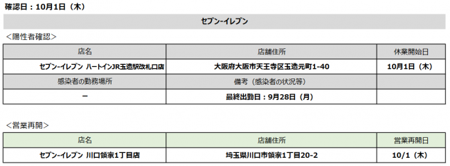 流通スーパーニュース > 新型コロナ > セブン&アイnews|10/2感染、セブン‐イレブンハートインJR玉造駅改札口店 セブン&アイnews|10/2感染、セブン‐イレブンハートインJR玉造駅改札口店 新型コロナ / 2020年10月02日 ツイート (株)セブン&アイ・ホールディングス(東京都千代田区、井阪隆一社長)が10月2日(金)に確認した新型コロナ感染者は、セブン‐イレブンハートインJR玉造駅改札口店(大阪府大阪市天王寺区玉造元町1‐40)の従業員1名だった。 また、10月1日(木)に、セブン‐イレブン川口領家1丁目店が営業再開している。 ツイート