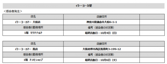 イトーヨーカ堂は、大船店(神奈川県鎌倉市大船6‐1‐1)、鳳店(大阪府堺市西区鳳南町3‐199‐12)のテナント従業員の感染が判明した。