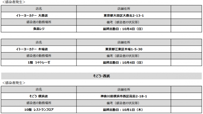 (株)セブン&アイ・ホールディングス(東京都千代田区、井阪隆一社長)が10月12日(月)に確認した新型コロナ感染者が判明したのは、セブン‐イレブン2店舗、イトーヨーカ堂2店舗、そごう・西武1店舗だった。