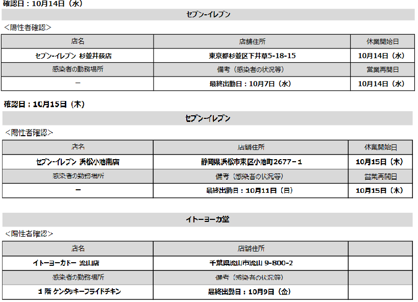 10月15日(木)に判明したのはセブン‐イレブン浜松小池南店(静岡県浜松市)とイトーヨーカドー流山店(千葉県流山市)1階のテナント「ケンタッキーフライドチキン」の従業員。