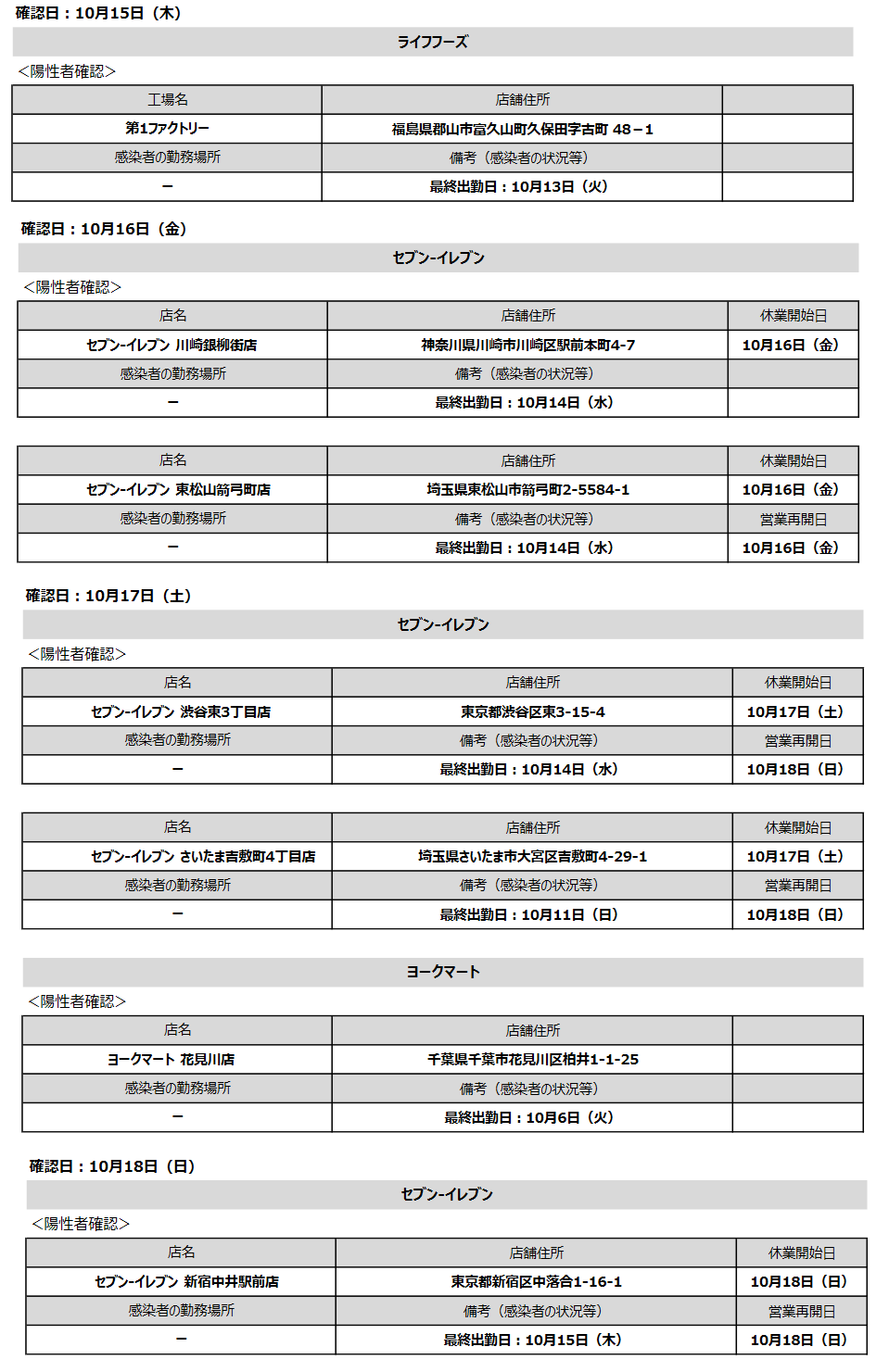 感染者が判明したのは、10月15日(木)にライフフーズの第1ファクトリー、10月16日(金)にセブン‐イレブン川崎銀柳街店(神奈川県川崎市)とセブン‐イレブン東松山箭弓町店(埼玉県東松山市)、10月17日(土)にセブン‐イレブン渋谷東3丁目店(東京都渋谷区)とセブン‐イレブンさいたま吉敷町4丁目店(さいたま市大宮区)、そしてヨークマート花見川店(千葉市花見川区)、10月18日(日)にはセブン‐イレブン新宿中井駅前店(東京都新宿区)。