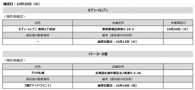 セブン&アイnews|10/21感染者発表/7-11新橋2丁目店とアリオ札幌で判明