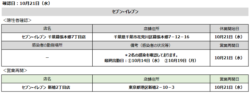 (株)セブン&アイ・ホールディングス(東京都千代田区、井阪隆一社長)は10月21日(水)に、セブン‐イレブン千葉幕張本郷7丁目店(千葉市花見川区)で勤務している2名の感染を確認した。