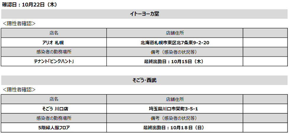 流通スーパーニュース > 新型コロナ > セブン&アイnews|アリオ札幌内テナントとそごう川口店の従業員が感染 セブン&アイnews|アリオ札幌内テナントとそごう川口店の従業員が感染 新型コロナ / 2020年10月23日 ツイート (株)セブン&アイ・ホールディングス(東京都千代田区、井阪隆一社長)は10月22日(木)に、(株)イトーヨーカ堂が運営する札幌市の「アリオ札幌」テナントと、(株)そごう・西武が運営する埼玉県川口市の「そごう川口店」で新型コロナウイルス感染者発生を確認した。 陽性の確認を受け、各店舗では所管行政機関等に連絡し、清掃・除菌等の作業を実施し、営業再開に臨む。 ツイート