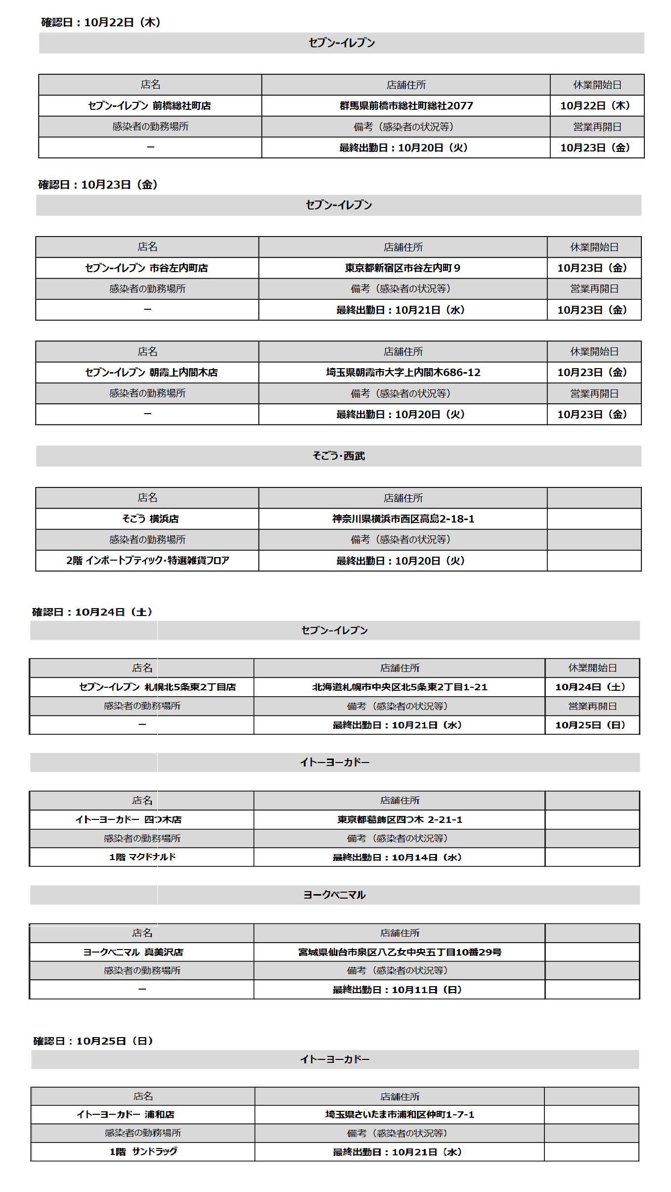 10月24日(土)に感染が判明したのは、セブン‐イレブン札幌北5条東2丁目店(北海道札幌市中央区北5条東2丁目1-21)、イトーヨーカドー四つ木店(東京都葛飾区四つ木 2-21-1)の1階に入居するマクドナルド従業員、そしてヨークベニマル真美沢店(宮城県仙台市泉区八乙女中央五丁目10番29号)の3カ所の従業員。