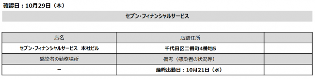 10月29日(木)に判明したのはセブン・フィナンシャルサービスで本社ビル(千代田区二番町4番地5)に勤務する従業員の感染だ。