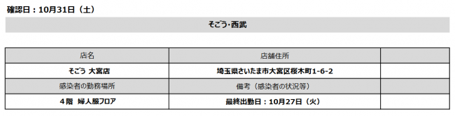 10月31日(土)には、そごう大宮店(埼玉県さいたま市大宮区桜木町1-6-2)の4階婦人服フロア勤務の従業員の感染が判明。