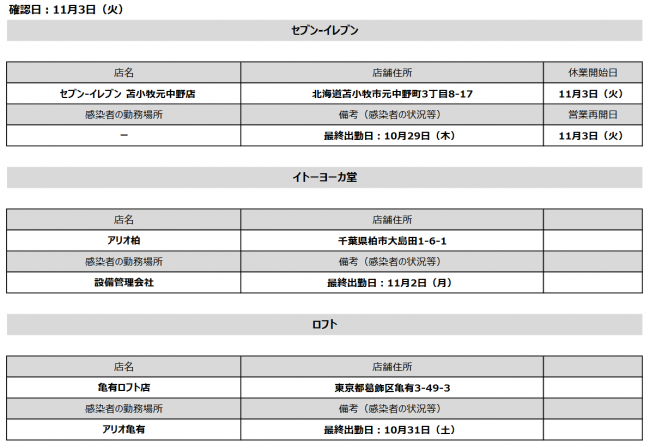 11月3日(火)には、セブン‐イレブン苫小牧元中野店(北海道苫小牧市元中野町3丁目8-17)、アリオ柏(千葉県柏市大島田1-6-1)の設備管理会社、アリオ亀有(東京都葛飾区亀有3-49-3)の亀有ロフト店で感染者が発生したことを確認。
