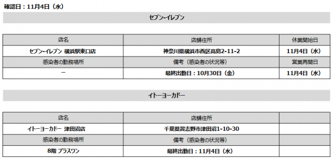 11月4日(水)は、セブン‐イレブン横浜駅東口店(神奈川県横浜市西区高島2-11-2)、イトーヨーカドー津田沼店(千葉県習志野市津田沼1-10-30)の8階プラスワンでの感染者発生が判明している。