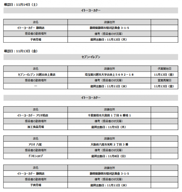 11月13日(金)に感染が判明したのは、セブン-イレブン川越古谷上東店(埼玉県川越市大字古谷上5692-18)の従業員、イトーヨーカドーアリオ柏店(千葉県柏市大島田 1丁目6 番地1)の加工食品売場従業員、イトーヨーカドーアリオ八尾(大阪府八尾市光町2丁目 3番)のドコモショップ従業員、イトーヨーカドー静岡店(静岡県静岡市駿河区曲金3-1-5)の子供売場の従業員。