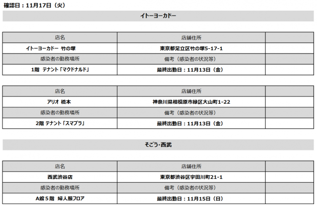 11月17日(火)に感染が判明したのは、イトーヨーカドー竹の塚(東京都足立区竹の塚5-17-1)のテナント「マクドナルド」従業員、ショッピングセンターのアリオ橋本(神奈川県相模原市緑区大山町1-22)のテナント「スマプラ」従業員、そして西武渋谷店(東京都渋谷区宇田川町21-1)の婦人服売場従業員。