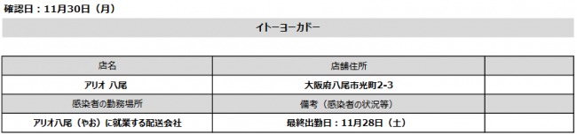 11月30日(月)に感染が判明したのは、アリオ八尾(大阪府八尾市光町2-3)に就業する配送会社。