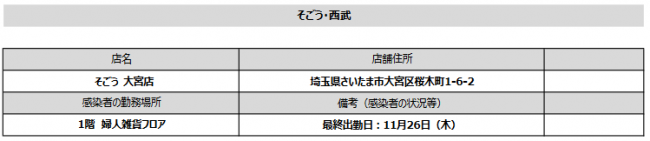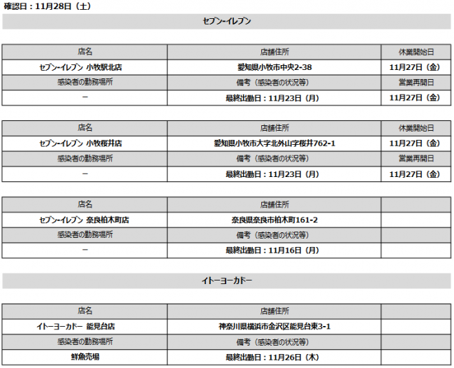 11月28日(土)に感染が判明したのは、セブン‐イレブン小牧駅北店(愛知県小牧市中央2‐38)、セブン‐イレブン小牧桜井店(愛知県小牧市大字北外山字桜井762‐1)、セブン‐イレブン奈良柏木町店(奈良県奈良市柏木町161‐2)、イトーヨーカドー能見台店(神奈川県横浜市金沢区能見台東3‐1) 鮮魚売場、イトーヨーカドー松戸店(千葉県松戸市松戸1149)、そごう大宮店(埼玉県さいたま市大宮区桜木町1‐6‐2)1階婦人雑貨フロア。