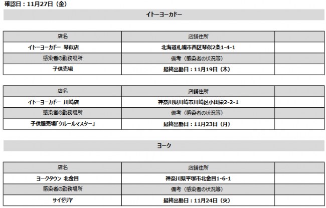 11月27日(金)に感染が判明したのは、イトーヨーカドー琴似店(北海道札幌市西区琴似2条1‐4‐1) 子供売場、イトーヨーカドー川崎店(神奈川県川崎市川崎区小田栄2‐2‐1) 子供服売場「クルールマスター」、ヨークタウン北金目(神奈川県平塚市北金目1‐6‐1)の「サイゼリヤ」。