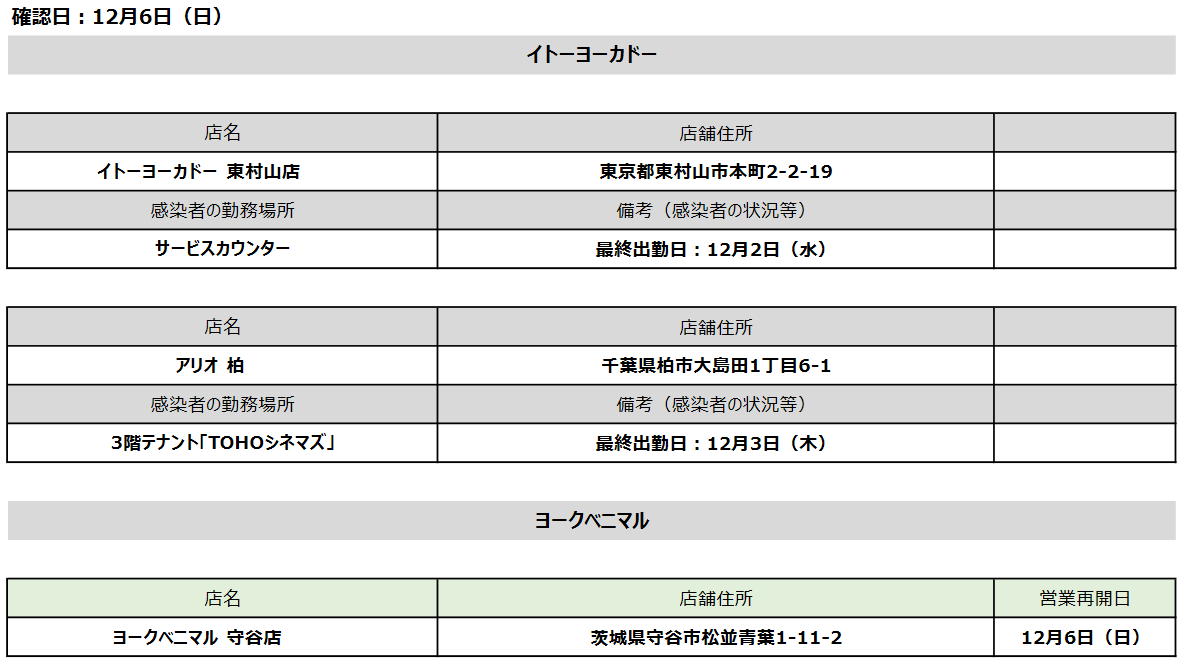12月6日(日)にはイトーヨーカドー東村山店(東京都東村山市)のサービスカウンター、アリオ柏(千葉県柏市)3階テナント「TOHOシネマズ」、ヨークベニマル守谷店(茨城県守谷市)の従業員の感染を確認している。