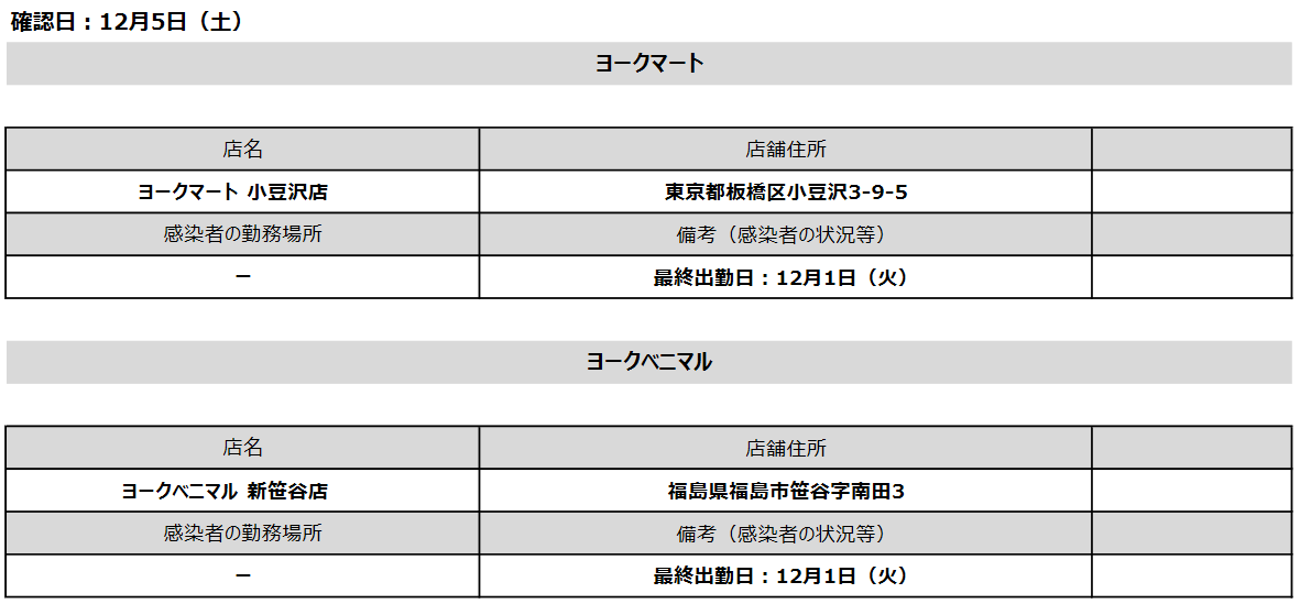 12月5日(土)は、ヨークマート小豆沢店(東京都板橋区)、ヨークベニマル新笹谷店(福島県福島市)の従業員の感染を確認。