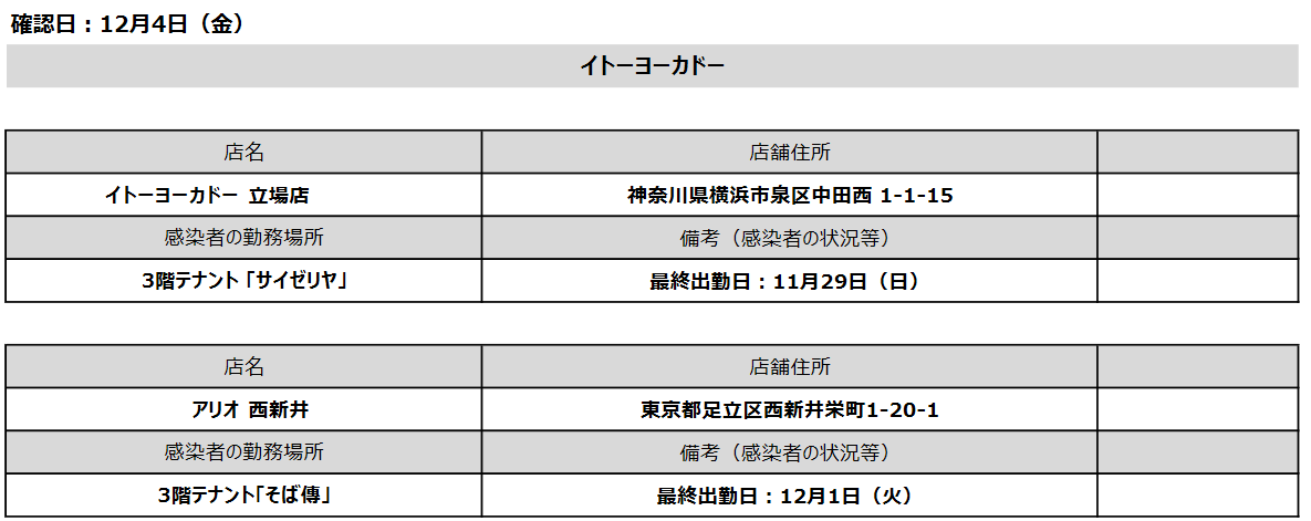 12月4日(金)に感染者が発生したのは、イトーヨーカドー立場店(横浜市泉区)3階テナント 「サイゼリヤ」、アリオ西新井(東京都足立区)3階テナント「そば傳」のテナント2店舗。