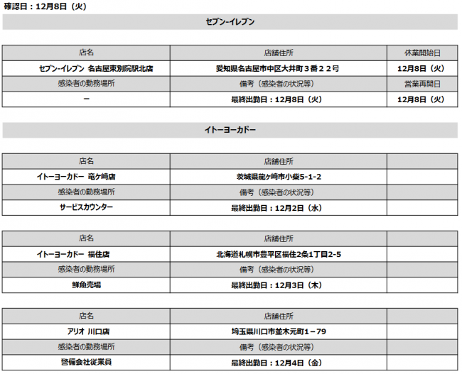 12月8日(火)に感染が判明したのは、セブン‐イレブン名古屋東別院駅北店(愛知県名古屋市中区大井町3番22号)、イトーヨーカドー竜ケ崎店(茨城県龍ヶ崎市小柴5‐1‐2)サービスカウンター、イトーヨーカドー福住店(北海道札幌市豊平区福住2条1丁目2‐5)鮮魚売場、アリオ川口店(埼玉県川口市並木元町1‐79)警備会社従業員。