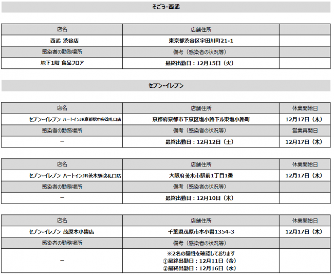 12月17日(木)に感染者が判明したのは以下の店舗と勤務場所。