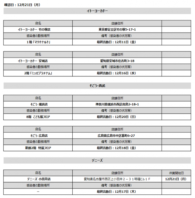 セブン&アイnews|12/22感染者発表/イトーヨーカドー・そごう、など