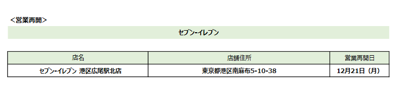 同日、セブン-イレブン港区広尾駅北店(東京都港区南麻布5-10-38)が営業再開した。