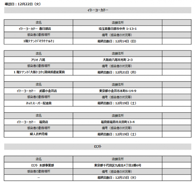 12月22日(火)に感染者が判明したのは以下の店舗と勤務場所。