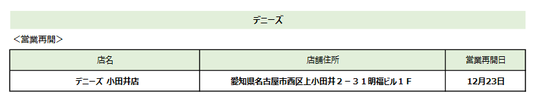 同日、デニーズ小田井店(愛知県名古屋市西区上小田井2-31明福ビル1F )が営業再開した。