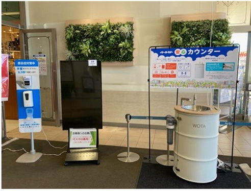 手洗い器は水道いらずのポータブル手洗いスタンド「WOSH」を、量販店・小売店では初めて設置する。