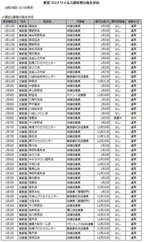 首都圏、近畿圏で店舗展開するライフは、コロナ感染者の急拡大に伴って、残念ながら従業員の感染発生が多い。そしてついに、同社でホームページでは1月14日から、毎日10時時点の感染状況をリストで発表する方式に変更した。しかも直近2週間の感染状況も掲示するようになった。これが感染増加の深刻さを表している。