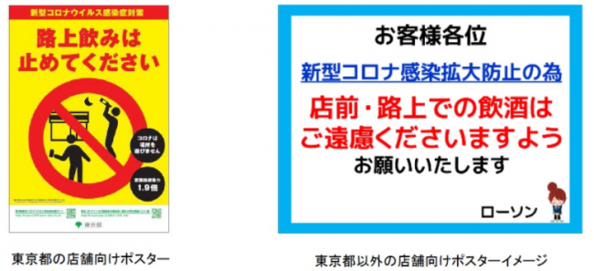 また、緊急事態宣言がでている北海道、東京都、愛知県、京都府、大阪府、兵庫県、岡山県、広島県、福岡県、さらに神奈川県、千葉県、埼玉県、群馬県、静岡県の14都道府県では、路上飲酒防止の注意喚起ポスターを各店舗の状況に応じて掲示している。