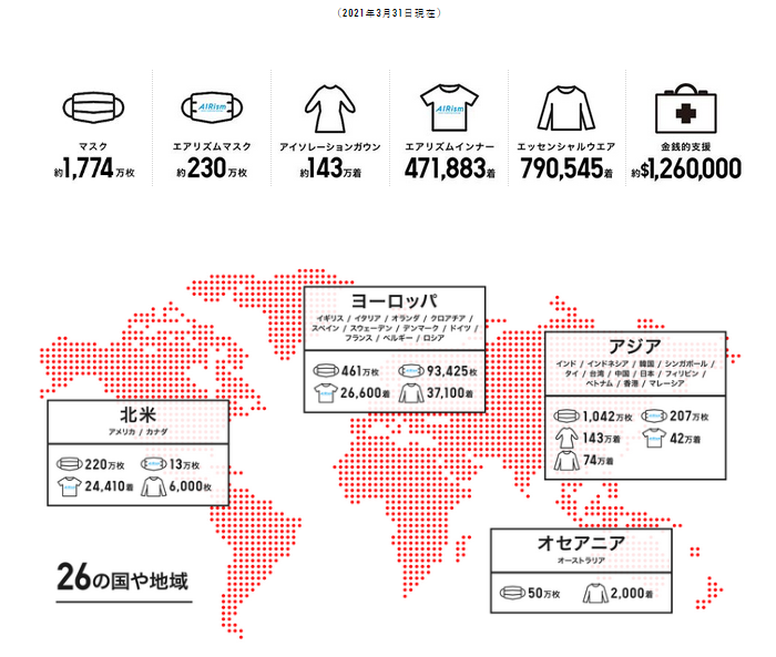 ファーストリテイリングの新型コロナウイルス感染症対策支援の活動は積極的で、2020年3月以降、日本を含め世界26の国と地域の医療機関やNPOなどに、医療用を中心としたマスク1774万点、アイソレーションガウン143万点、「エアリズムマスク」230万点、「エアリズムインナー」47万点、その他衣料79万点などを提供している。