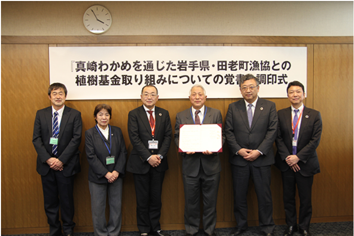 この植樹基金は、田老町漁協で生産している「CO・OP 真崎わかめ」を通じ、「将来にきれいな海を残すための植樹活動への取り組み」へ寄付を行うものだ。2018年3月に岩手県田老町漁協、いわて生協、コープ東北サンネット事業連合、コープこうべ、日本生協連の5者で覚書を交わし、この度コープさっぽろがその輪に加わった。