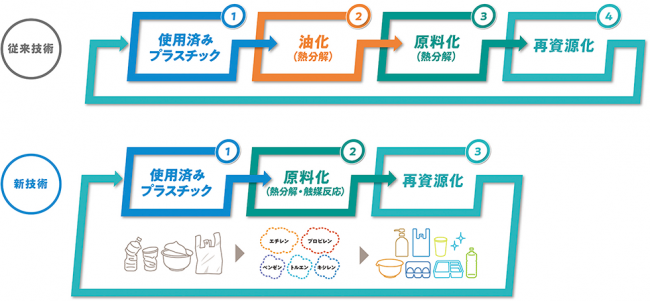 従来の油化工程を経由するケミカルリサイクルよりも少ない工程で処理でき、CO2排出量やエネルギー必要量の抑制につながるものと期待される。この技術が確立できれば、より多くの使用済みプラスチックを効率的に再生利用することができる。
