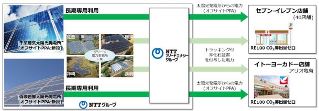 セブン-イレブン40店舗へはグリーン電力、オフサイトPP(NTT AE千葉若葉太陽光発電所)ともに6月から、アリオ亀有へはグリーン電力が4月から、オフサイトPPA(NTT AE香取岩部太陽光発電所)が2022年1月から供給を開始する。