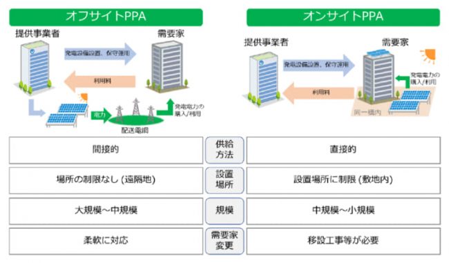 オフサイトPPAとは、オフサイト型コーポレートPPA(電力購入契約:Power Purchase Agreement)の略で、コーポレートPPAは、需要家が発電事業者から再生可能エネルギーの電力を長期に購入する契約。
