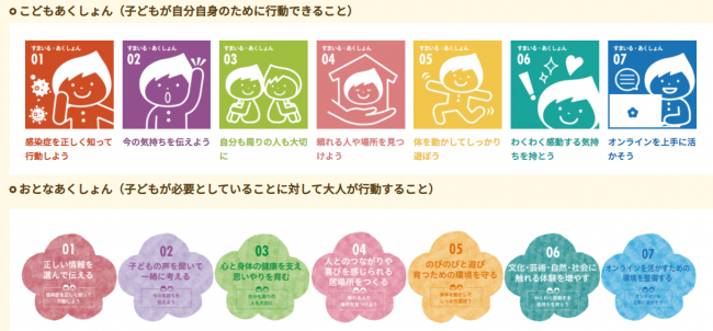 「すまいる・あくしょん」は2020年10月に、滋賀県の小学生、中学生、高校生、大学生等3万1320人の子どもたちの声(アンケート)をもとに作成した、新しい行動様式である。どのような環境でも子どもの笑顔を増やすことを目的に策定された。