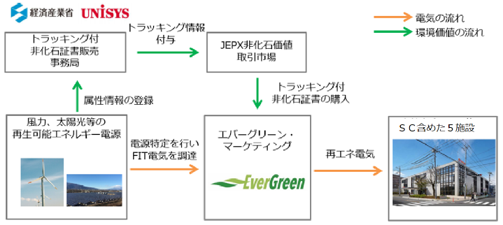 調達する電力は、再生可能エネルギー電源から調達したFIT電気(太陽光、風力、水力、地熱、バイオマスの再生可能エネルギー電源を用いて発電され、固定価格買取制度=FITによって電気事業者に買い取られた電気)に、トラッキング付非化石証書を付加することによって、実質再生可能エネルギー100%の電力となる。それを導入する。