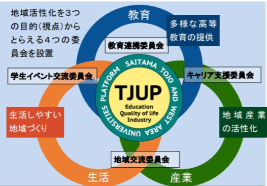 TJUPは、埼玉県の東武東上線沿線と西武線沿線の大学、短期大学、自治体、企業が連携している団体だ。地域活性化のため「地元で生まれ、地元で育ち、地元で生きていく若い世代への支援」というビジョンのもとに「多様な高等教育の提供」「生活しやすい地域づくり」「地域産業の活性化」を掲げて活動している。