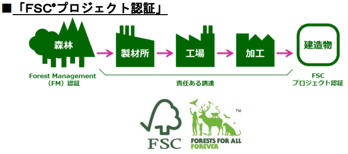 この認証は、国際的なNGOであるFSC(Forest Stewardship Council®:森林管理協議会)の理念に基づき、環境・社会・経済の観点から適切に管理された森林から産出されたFSC認証材を、他の材の混入などなく、正しく追跡可能な調達方法によりつくられた建造物であることを証明するというもの。認証には全体認証と部分認証があるが、モクイクひろばに使用されたスギ材・ナラ材のすべてが責任ある調達をされたFSC認証材であることから、全体認証を取得した。