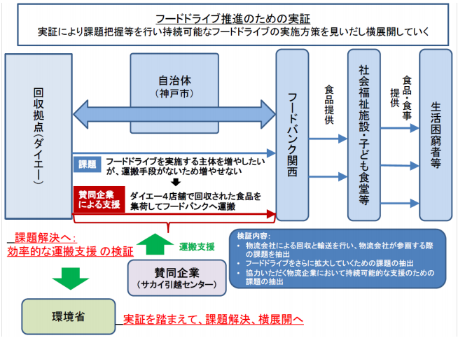 そのため従来からフードドライブを実施している神戸市内4店舗で回収された食品を、サカイ引越センターが店舗からフードバンク等へ運搬する実証を行って、その際の効率的な運搬方法や課題について検証する。