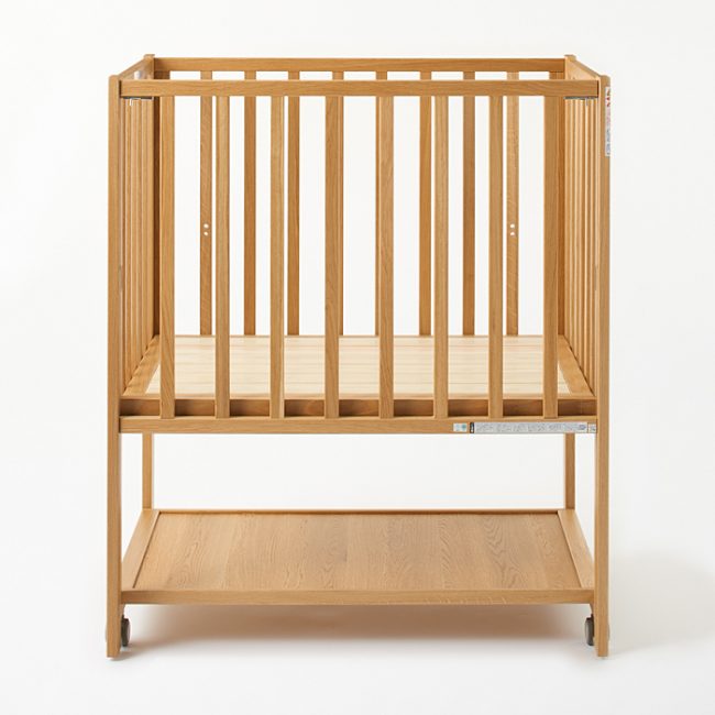 ベビーベッドは2015年に発売した「ひのき材ベビーベッド」をオーク材に変更することで強度を増し、底板を加えることで収納ケースなどを乗せられる仕様に改良したもの。寝室やリビングにも置きやすい、コンパクトなサイズのベビーベッドだ。
