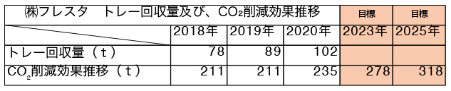 フレスタはエフピコと協業し、トレーのリサイクル活動を通じて、CO2削減目標を設定した。具体的な活動内容として、トレーの回収量とエコトレー使用比率を向上させることを挙げている。2025年までに318トンのCO2削減を目標としている。一方でエフピコでは、発泡トレーリサイクル工場で使用する電力を2025年3月までに全量再生可能エネルギーでまかなうことで、再生原料製造時のCO2排出量をゼロ(オフセット)にする。