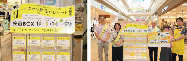 地域のボランティア団体やNPO法人と実施しているイオン幸せの黄色いレシートキャンペーンは、毎月11日のイオン・デーにお客に渡す黄色いレシートを、団体名や活動内容が書かれた専用ボックスに投函してもらい、レシート合計金額の1%相当分の希望する品物を各団体に寄贈するというもの。