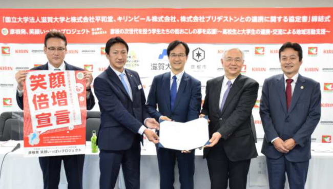 5月17日(月)、「国⽴⼤学法⼈滋賀⼤学と株式会社平和堂、キリンビール株式会社、株式会社ブリヂストンとの連携に関する協定書」 の締結式が彦根市市役所で行われた。後援者は和田裕⾏彦根市長。