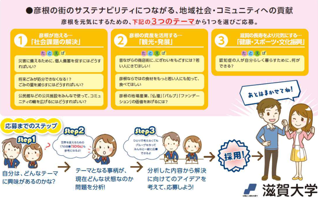 •募集テーマは「彦根の街のサステナビリティに繋がる、地域社会、コミュニティへの貢献」として、下の 3 つのテーマの中から 1 つ選択する。