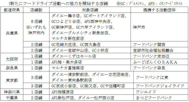 同社では2017年から「家庭で消費されずに残っている未開封かつ賞味期限内の加工食品」の提供を顧客に呼びかけ、届けられた食品を、提携しているフードバンク団体等に寄贈する「フードドライブ」活動を神戸市内の店舗で開始した。段階的に取り組み店舗を拡げてきたが、さらに神戸市内8店舗を含む24店舗で取り組む。