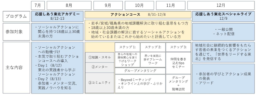 プログラムの名称は「TOMODACHI ファミリーマートSDGs リーダーシッププログラムin 東北~東北から全国へ、そして世界へ~」。約5カ月間にわたって「応援しあう東北アカデミー」、「アクションコース」、「応援しあう東北スペシャルライブ」の3部構成の研修を行う。