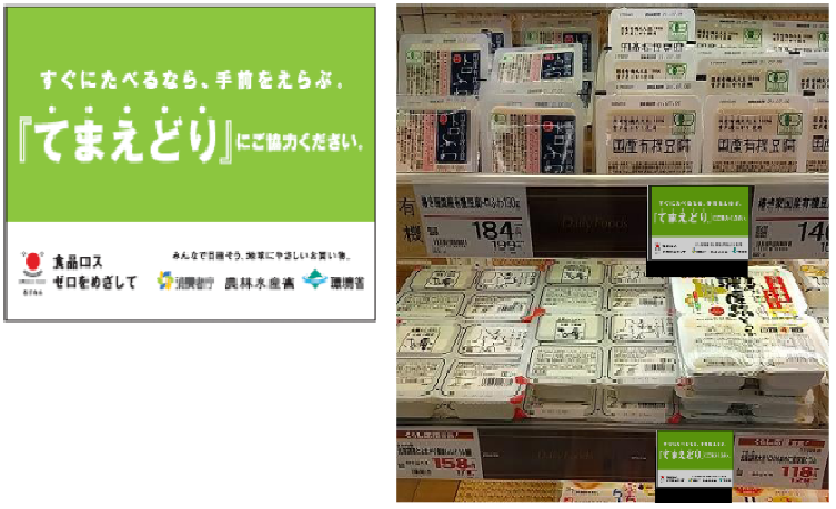 「てまえどり」は消費者庁、農林水産省、環境省の3省庁が推進する消費行動で、購入してすぐに食べる場合に、商品棚の手前にある商品など、販売期限の迫った商品を積極的に選ぶことをいう。販売期限が過ぎて廃棄されることによる食品ロスを削減する効果が期待されている。