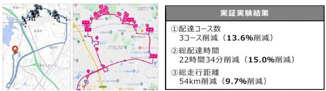 2021年5月、コープあいち三好センターで行われた実証実験では、AIソリューション「Loogia」を使ってより生産性の高い配達コースを設計し、実際にコースを確認しながら配達時間や走行距離を検証した。その結果、配達コース数は3コース、総配達時間は22時間34分、総走行距離は54km、それぞれ13.6%、15.0%、9.7%削減できることが実証された。